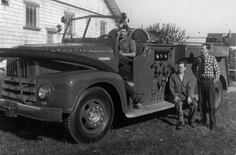 Les Martin, Engine Co. 1 foreman, is in the driver’s seat. Alan Peers, distributor for International trucks in the Ferndale area and from whose firm the fire truck was purchased, is sitting by the truck’s control panel. Ferndale Fire Chief Norman Clough, a six footer, is dwarfed as he stands by the truck.